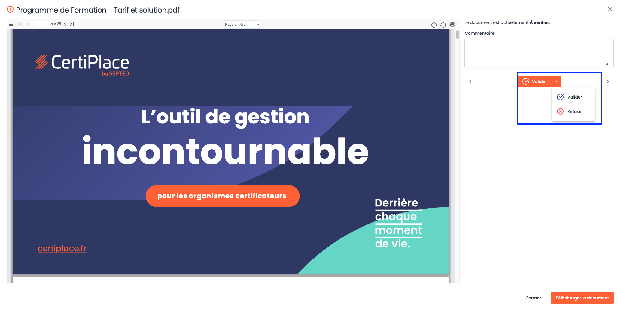 En tant qu'organisme de formation, vous avez la possibilité de valider ou de refuser un document qu’un apprenant vous a transmis :