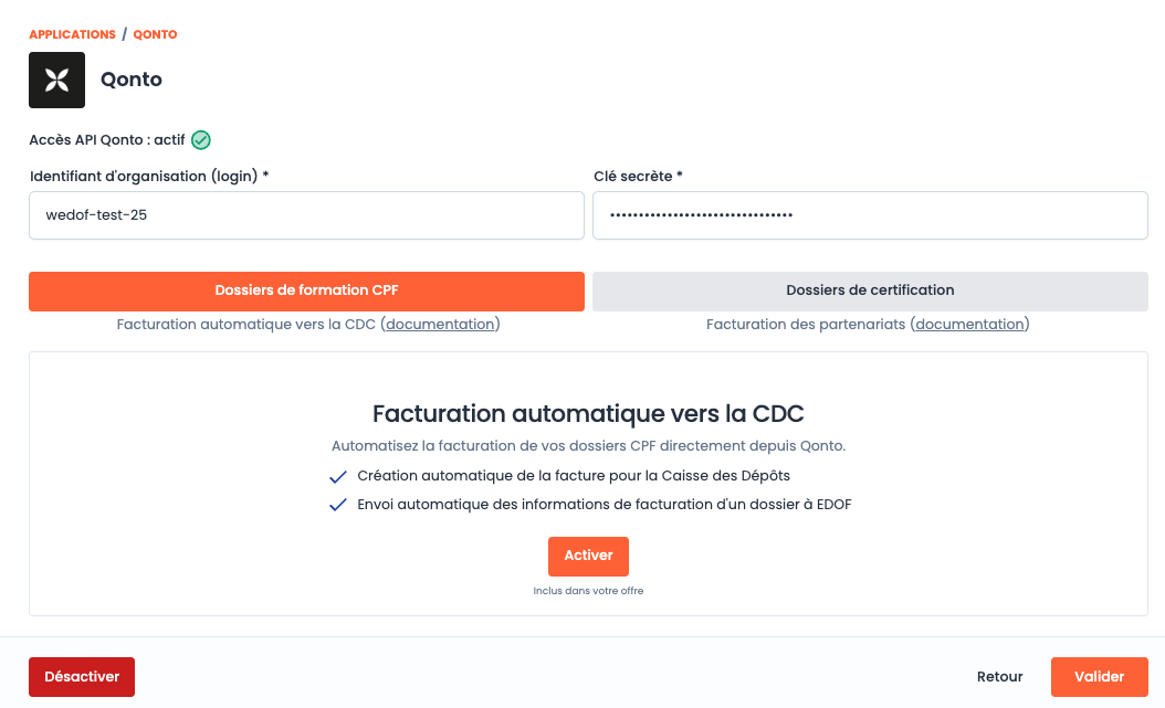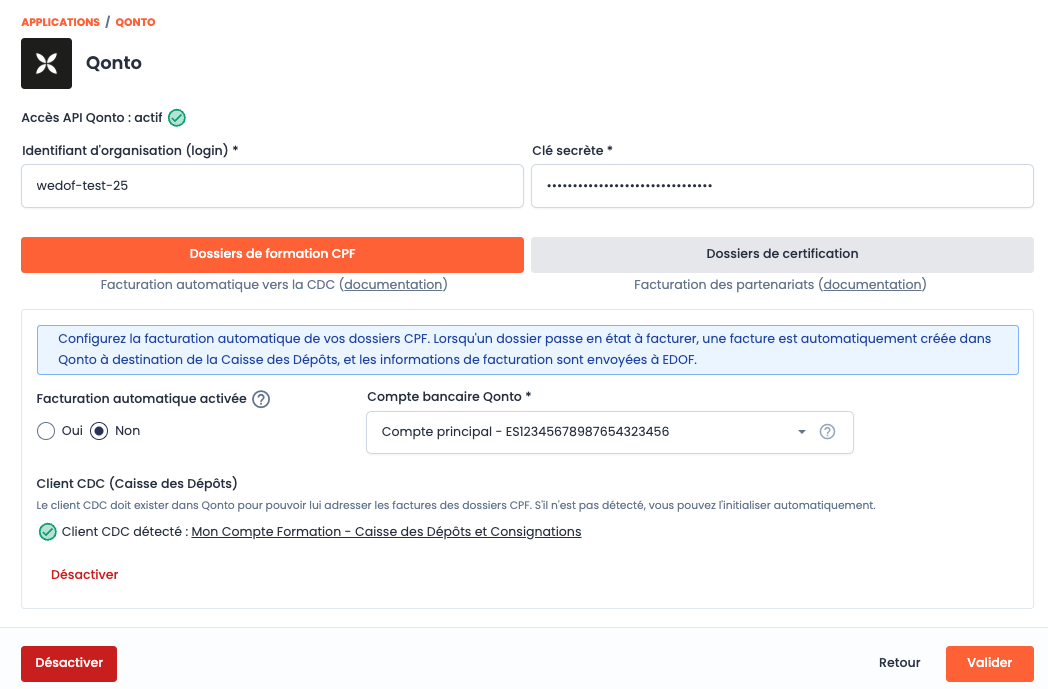 Lorsqu'un de vos dossiers CPF (MonCompteFormation) passe en état "à facturer", une facture est automatiquement créée dans Qonto à destination de la Caisse des Dépôts. Les informations de facturation sont également transmises automatiquement à EDOF.