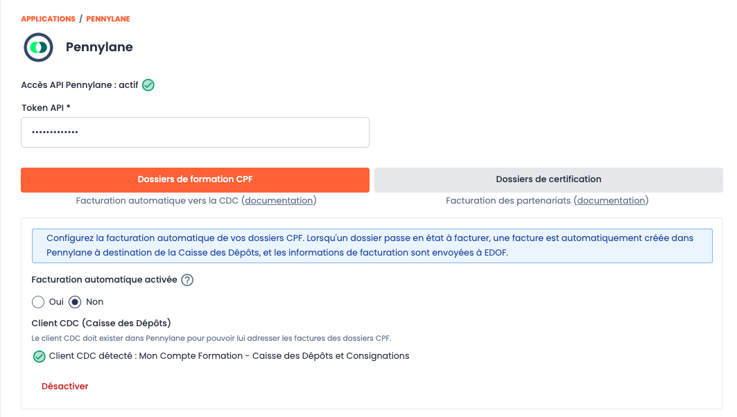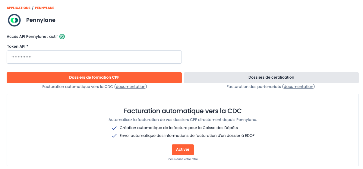 Lorsqu'un de vos dossiers CPF (MonCompteFormation) passe en état "à facturer", une facture est automatiquement créée dans Pennylane à destination de la Caisse des Dépôts. Les informations de facturation sont également transmises automatiquement à EDOF.