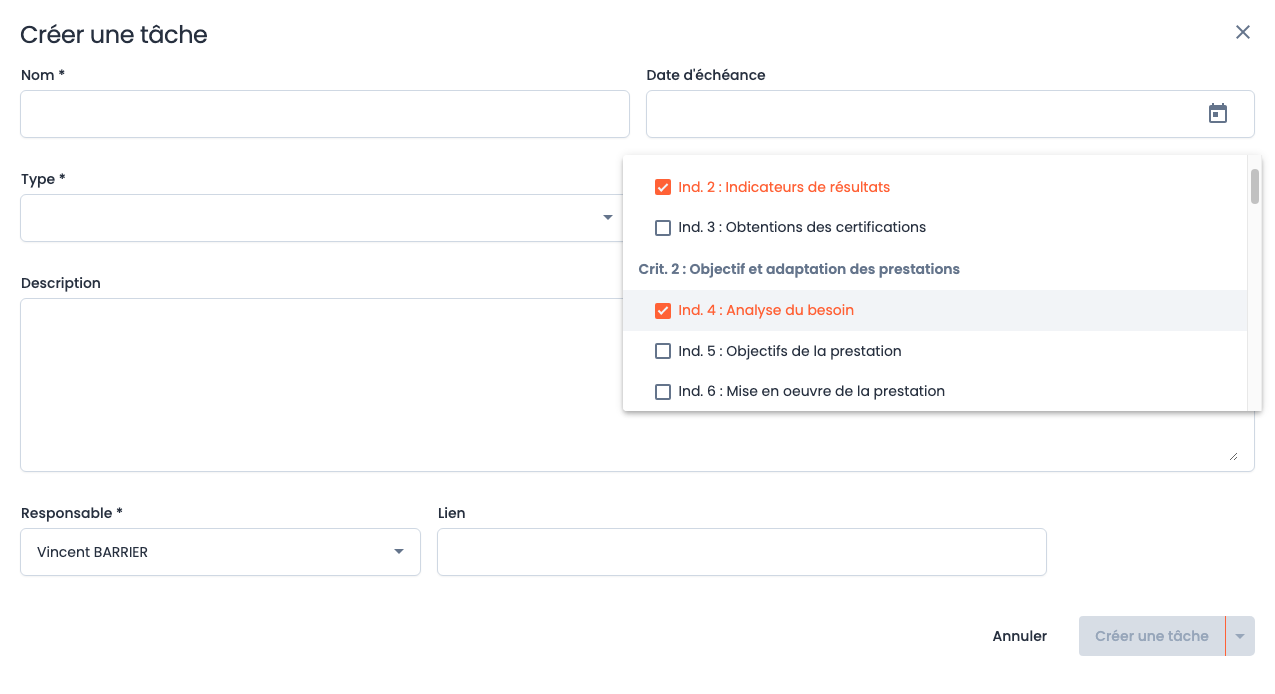 Lors de la création, vous pouvez sélectionner différents indicateurs Qualiopi parmi les 32 présents :